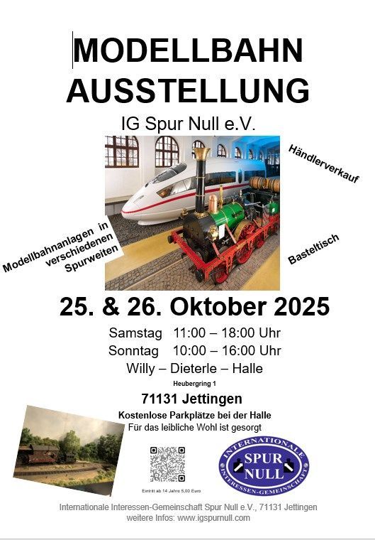 Wir möchten alle interessierten Modelleisenbahner zu unserer Modellbahnausstellung am 25.10. & 26.10.2025 einladen. Wir, die Internationale Interessen-Gemeinschaft Spur Null e.V. haben verschiedene Händler und Aussteller aus der Region und aus Süddeutschland sowie aus dem benachbarten Ausland, mit Exponaten in verschiedenen Spurweiten, nach Jettingen in Baden-Württemberg eingeladen.